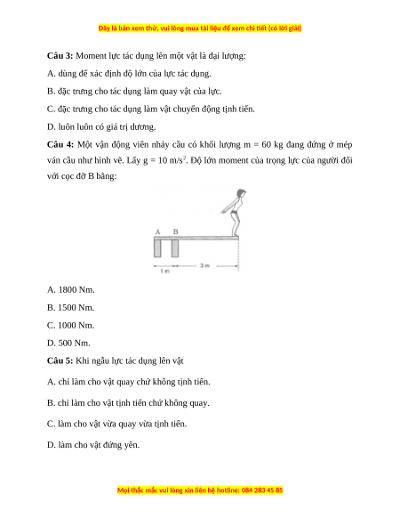 Câu 3: Moment lực tác dụng lên một vật là đại lượng:
