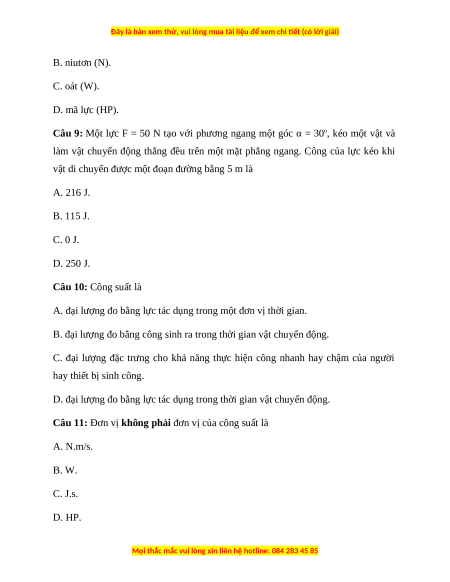 Câu 9: Một lực F = 50 N tạo với phương ngang một góc α = 30o, kéo một vật và
