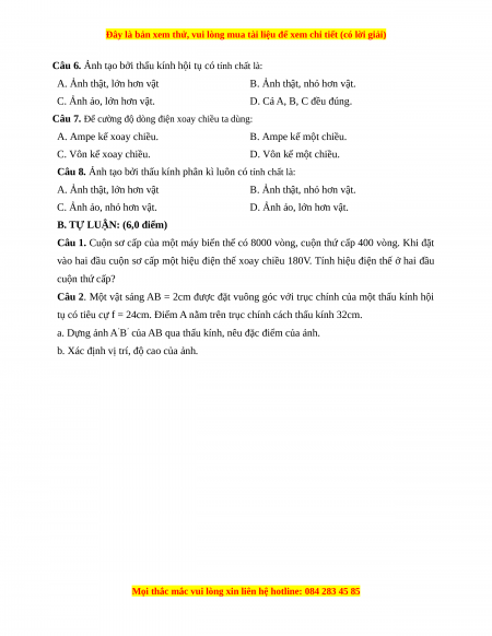 Câu 1. Cuộn sơ cấp của một máy biến thế có 8000 vòng, cuộn thứ cấp 400 vòng. Khi đặt