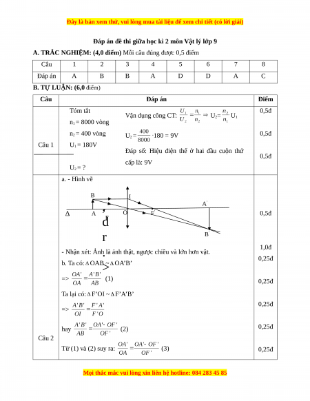 Đáp số: Hiệu điện thế ở hai đầu cuộn thứ 0,5đ cấp là: 9V U2 = ? a. - Hình vẽ B I ., . A' Δ A F' O 0,5đ dF r B' 1,0đ