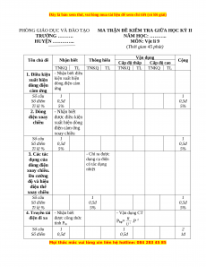 MA TRẬN ĐỀ KIỂM TRA GIỮA HỌC KỲ II TRƯỜNG ………. NĂM HỌC: ……….. HUYỆN ………….. MÔN: Vật lí 9 (Thời gian 45 phút) Vận dụng Tên chủ đề Nhận biết Thông hiểu Cộng Cấp độ thấp Cấp độ cao TNKQ TL TNKQ TL TNKQ TL TNKQ TL