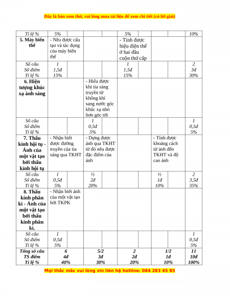 Tỉ lệ % 5% 5% 10% 5. Máy biến - Nêu được cấu - Tính được thế tạo và tác dụng hiệu điện thế của máy biến ở hai đầu thế cuộn thứ cấp Số câu 1 1 2 Số điểm 1,5đ 1,5đ 3đ Tỉ lệ % 15% 15% 30% 6. Hiện - Hiểu được tượng khúc khi tia sáng xạ ánh sáng truyền từ không khí sang nước góc khúc xạ nhỏ hơn góc tới Số câu 1 1 Số điểm 0,5đ 0,5đ Tỉ lệ % 5% 5% 7. Thấu - Nhận biết - Dựng được - Tính được