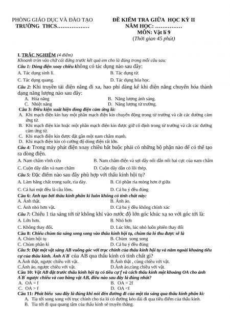 Đề thi giữa kì 2 Vật lí 9 năm 2023 - Đề 4