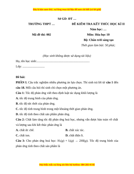 ĐỀ KIỂM TRA KẾT THÚC HỌC KÌ II Năm học: … Mã đề thi: 002 Môn: Hóa học 10