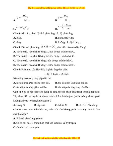 Câu 4: Khi tăng nồng độ chất phản ứng, tốc độ phản ứng A. giảm. B. không thay đổi. C. tăng.