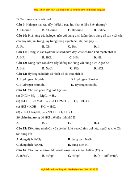 Câu 9: Halogen nào sau đây thể khí, màu lục nhạt ở điều kiện thường? A. Fluorine. B. Chlorine. C. Bromine. D. Iodine.