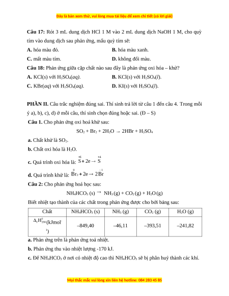 Câu 14: Cho các phản ứng hoá học sau: (a) 2HCl + Mg → MgCl2 + H2.