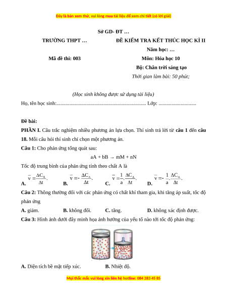 ĐỀ KIỂM TRA KẾT THÚC HỌC KÌ II Năm học: … Mã đề thi: 003 Môn: Hóa học 10