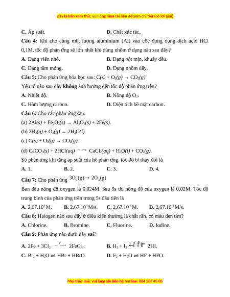 Yếu tố nào sau đây không ảnh hưởng đến tốc độ phản ứng trên? A. Nhiệt độ. B. Nồng độ O2.