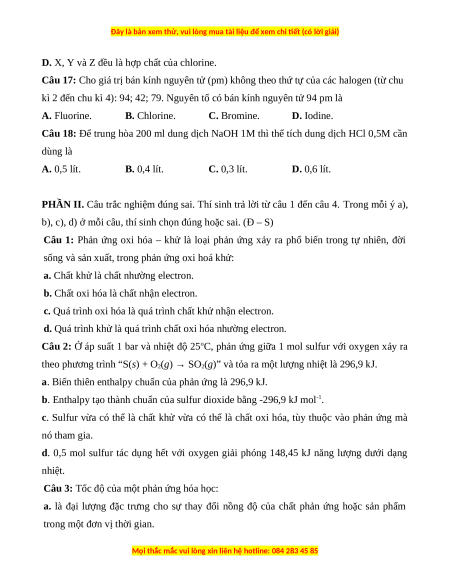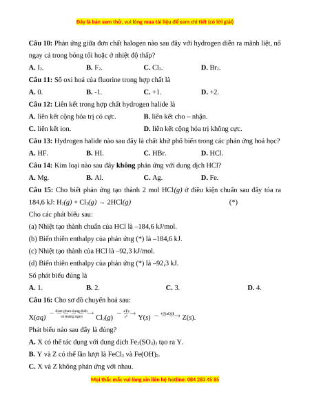 Câu 13: Hydrogen halide nào sau đây là chất khử phổ biến trong các phản ứng hoá học? A. HF. B. HI. C. HBr. D. HCl.