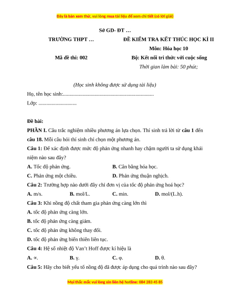 ĐỀ KIỂM TRA KẾT THÚC HỌC KÌ II Môn: Hóa học 10 Mã đề thi: 002