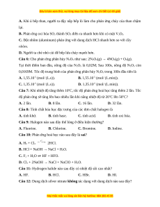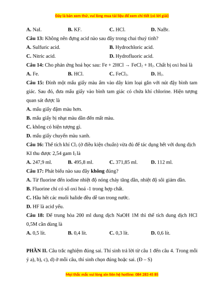 Câu 9: Halogen nào sau đây thể lỏng ở điều kiện thường? A. Fluorine. B. Chlorine. C. Bromine. D. Iodine.