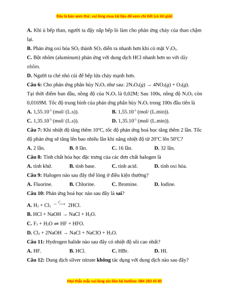 Câu 6: Cho phản ứng phân hủy N2O5 như sau: 2N2O5(g) → 4NO2(g) + O2(g).