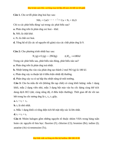 Câu 8: Tính chất hóa học đặc trưng của các đơn chất halogen là A. tính khử. B. tính base. C. tính acid. D. tính oxi hóa.