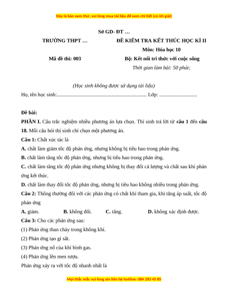 ĐỀ KIỂM TRA KẾT THÚC HỌC KÌ II Môn: Hóa học 10 Mã đề thi: 003