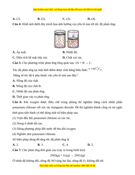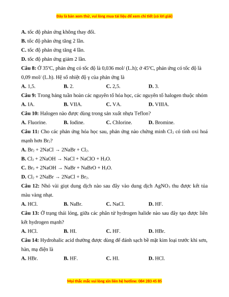 Câu 8: Ở 35oC, phản ứng có tốc độ là 0,036 mol/ (L.h); ở 45oC, phản ứng có tốc độ là