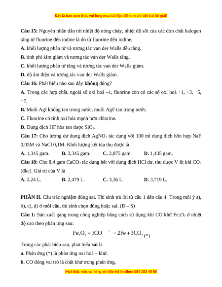 Câu 14: Hydrohalic acid thường được dùng để đánh sạch bề mặt kim loại trước khi sơn, hàn, mạ điện là A. HBr. B. HF. C. HI. D. HCl.
