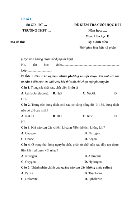 ĐỀ KIỂM TRA CUỐI HỌC KÌ I TRƯỜNG THPT … Năm học: …. Môn: Hóa học 11 Mã đề thi: Bộ: Cánh diều