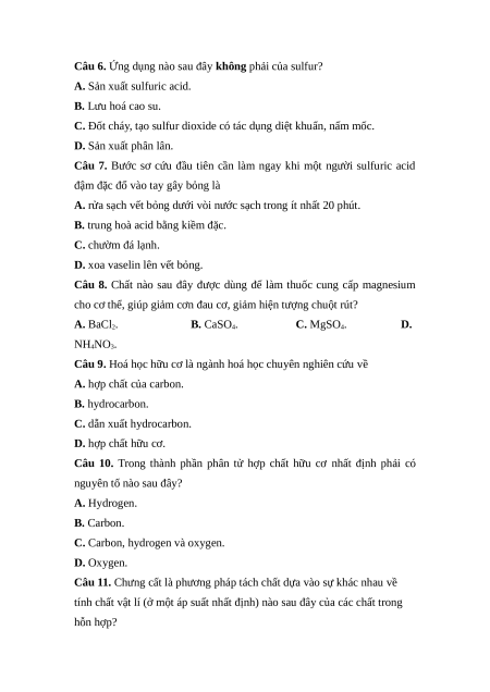Câu 6. Ứng dụng nào sau đây không phải của sulfur?