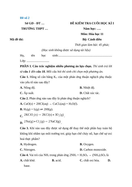 ĐỀ KIỂM TRA CUỐI HỌC KÌ I TRƯỜNG THPT … Năm học: …. Môn: Hóa học 11 Mã đề thi: Bộ: Cánh diều
