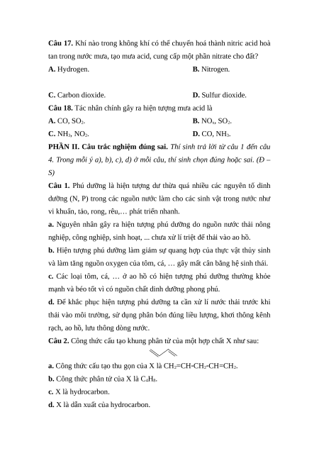 Câu 18. Tác nhân chính gây ra hiện tượng mưa acid là A. CO, SO2. B. NOx, SO2. C. NH3, NO2. D. CO, NH3.