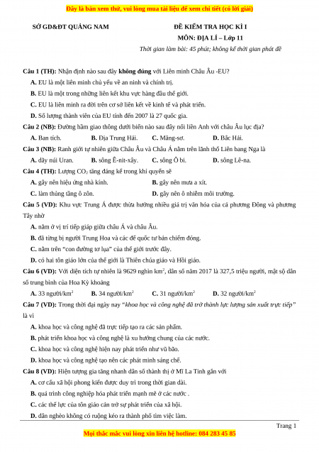 Đề thi học kì 1 Địa lý 11 Sở GD_ĐT Quảng Nam