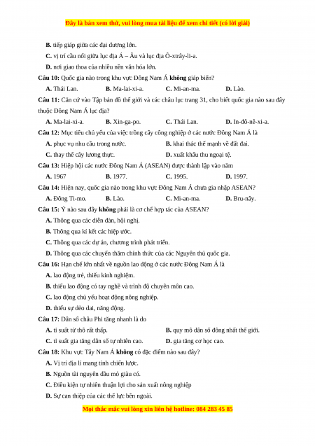Câu 10: Quốc gia nào trong khu vực Đông Nam Á không giáp biển? A. Thái Lan. B. Ma-lai-xi-a. C. Mi-an-ma. D. Lào.