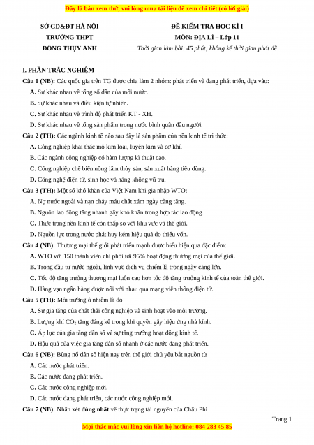 MÔN: ĐỊA LÍ – Lớp 11 ĐÔNG THỤY ANH
