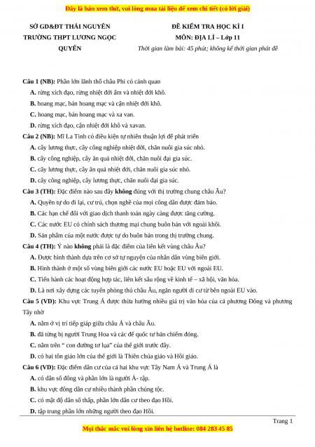 Đề thi học kì 1 Địa lý 11 trường THPT Lương Ngọc Quyến - Thái Nguyên
