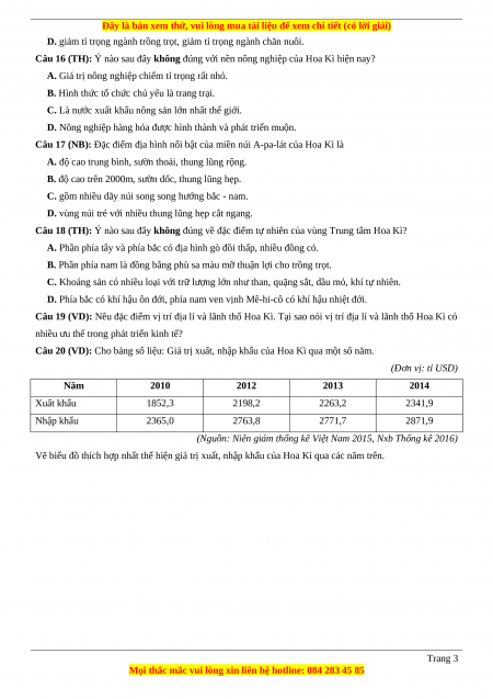 Câu 15 (NB): Cơ cấu nông nghiệp Hoa Kì có sự chuyển dịch