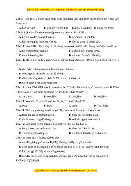 Câu 8: Vấn đề có ý nghĩa quan trọng hàng đầu trong việc phát triển ngành trồng trọt ở khu vực Trung Á là A. bảo vệ rừng