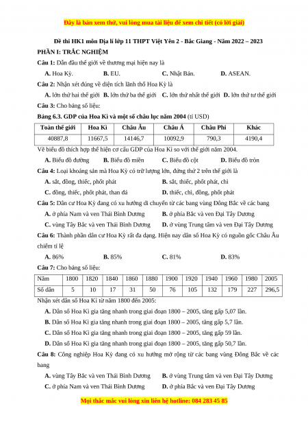 Đề thi học kì 1 Địa lý 11 trường THPT Việt Yên 2 - Bắc Giang