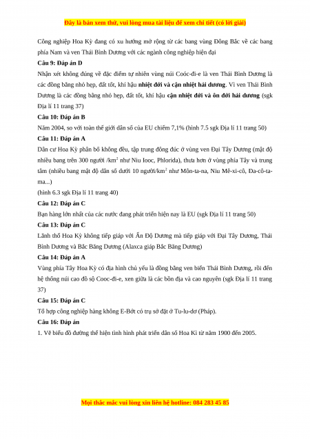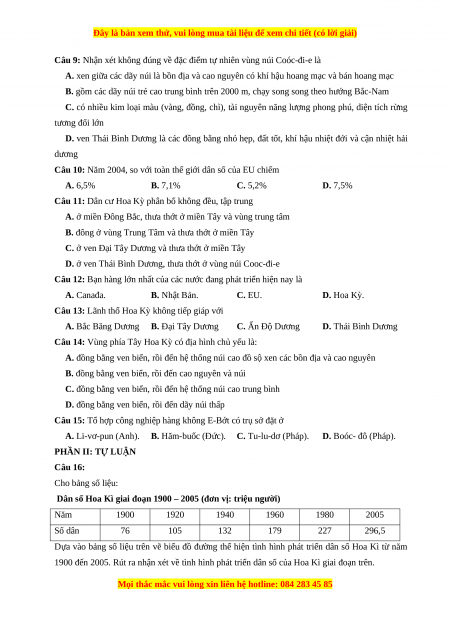Câu 6: Thành phần dân cư Hoa Kỳ rất đa dạng. Hiện nay dân số Hoa Kỳ có nguồn gốc Châu Âu chiểm tỉ lệ A. 86% B. 85% C. 81% D. 83%