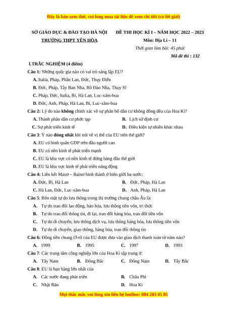 Đề thi học kì 1 Địa lý 11 trường THPT Yên Hòa - Hà Nội