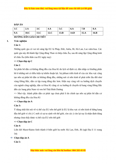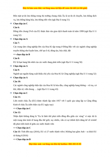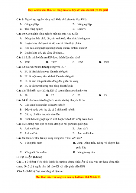Câu 6: Đồng tiền chung Ơ-rô của EU được đưa vào giao dịch thanh toán từ năm nào? A. 1999 B. 1995 C. 1997 D. 1993