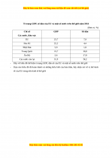 Tỉ trọng GDP, số dân của EU và một số nước trên thế giới năm 2014 (Đơn vị: %) Chỉ số GDP Số dân Các nước, khu vực EU 23,7 7,0 Hoa Kì 22,2 4,4 Nhật Bản 5,9 1,8 Trung Quốc 13,7 18,8 Ấn Độ 2,6 17,8 Các nước còn lại 31,9 50,2 -