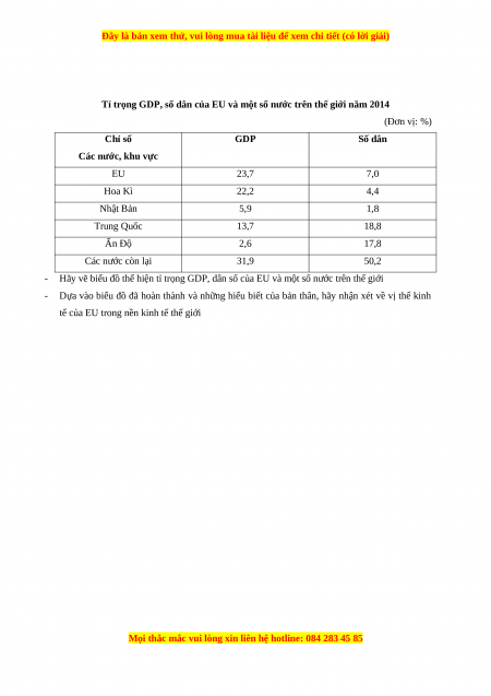 Hãy vẽ biểu đồ thể hiện tỉ trọng GDP, dân số của EU và một số nước trên thế giới -