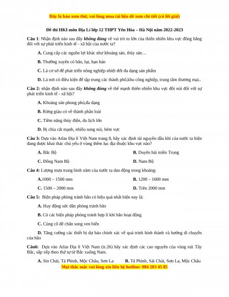 +Đề thi học kì 1 Địa Lý năm 2023 trường THPT Yên Hòa - Hà Nội;