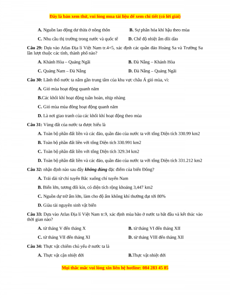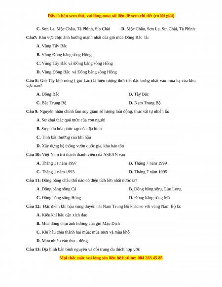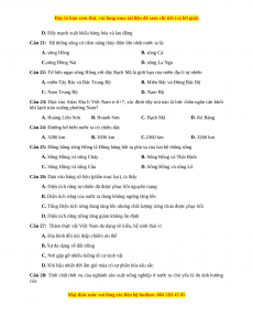 Câu 8: Gió Tây khô nóng ( gió Lào) là hiện tượng thời tiết đặc trưng nhất vào mùa hạ của khu vực nào? A. Đông Bắc B. Tây Bắc C. Bắc Trung Bộ D. Nam Trung Bộ