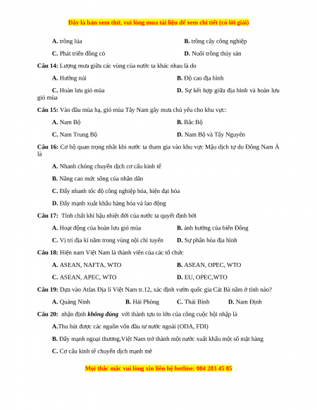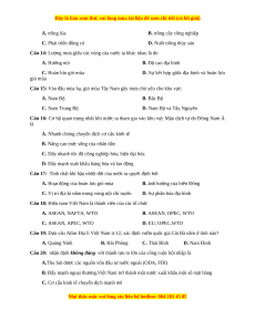 Câu 18: Hiện nam Việt Nam là thành viên của các tổ chức A. ASEAN, NAFTA, WTO B. ASEAN, OPEC, WTO C. ASEAN, APEC, WTO D. EU, OPEC,WTO