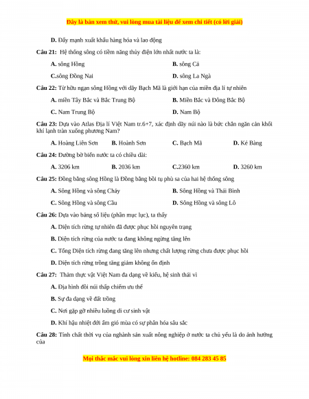 Câu 21: Hệ thống sông có tiềm năng thủy điện lớn nhất nước ta là: A. sông Hồng B. sông Cả C.sông Đồng Nai D. sông La Ngà