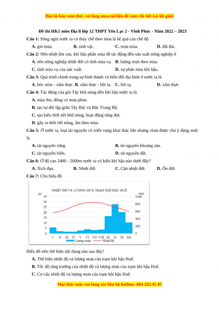 Đề thi HK1 môn Địa lí lớp 12 THPT Yên Lạc 2 - Vĩnh Phúc - Năm 2022 – 2023