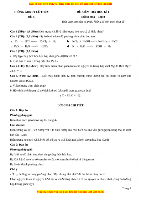 ĐỀ KIỂM TRA HỌC KÌ I ĐỀ B MÔN: Hóa – Lớp 8