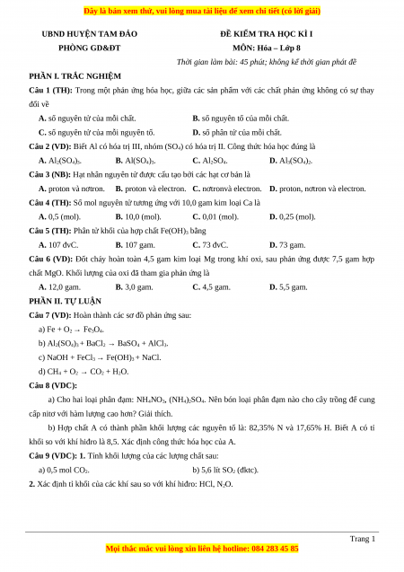Đề thi học kì 1 Hóa lớp 8 năm 2023 Phòng GD và ĐT Tam Đảo