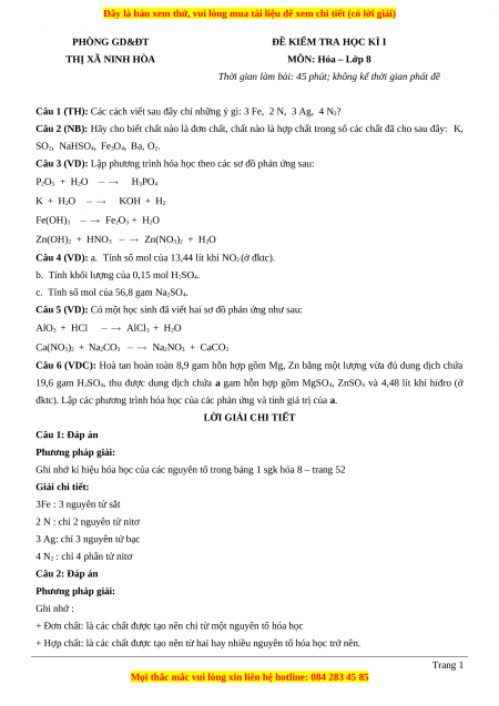 ĐỀ KIỂM TRA HỌC KÌ I THỊ XÃ NINH HÒA MÔN: Hóa – Lớp 8