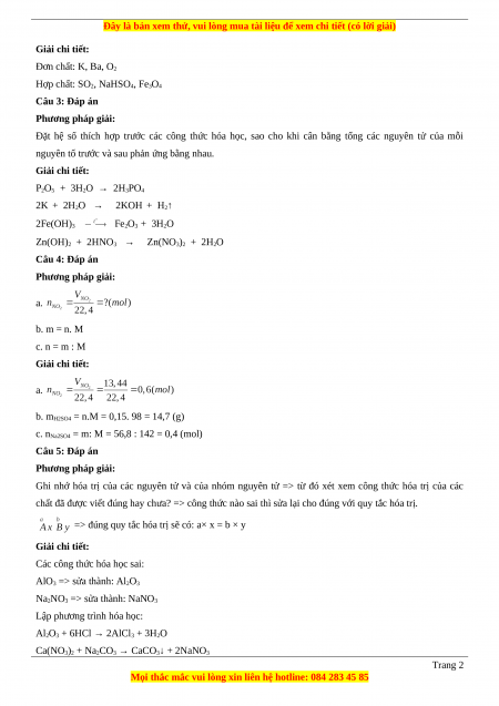 nguyên tố trước và sau phản ứng bằng nhau. Giải chi tiết: P2O5 + 3H2O → 2H3PO4 2K + 2H2O → 2KOH + H2↑ 2Fe(OH)3 Fe2O3 + 3H2O