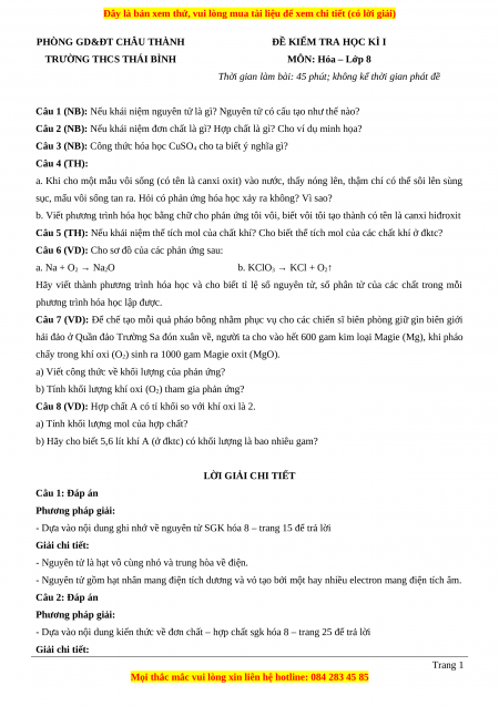 + Đề thi học kì 1 Hóa học năm 2023 trường THCS Thái Bình;