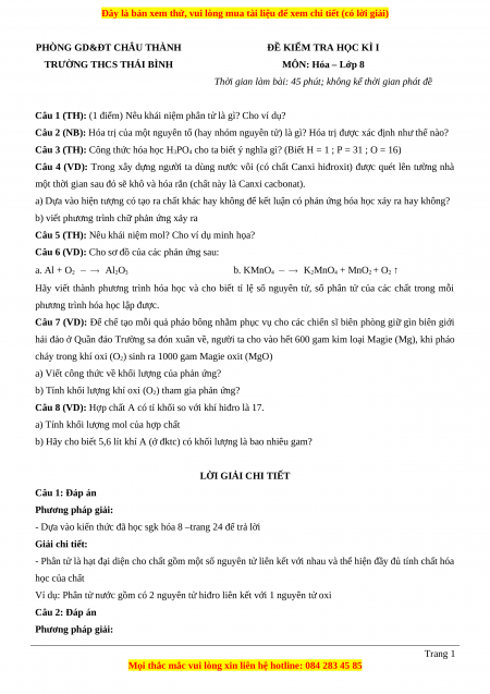 Đề thi học kì 1 Hóa lớp 8 năm 2023 trường THCS Thái Bình - Châu Thành
