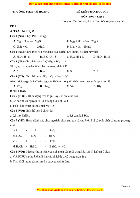 +Đề thi học kì 1 Hóa học năm 2023 trường THCS Tô Hoàng;