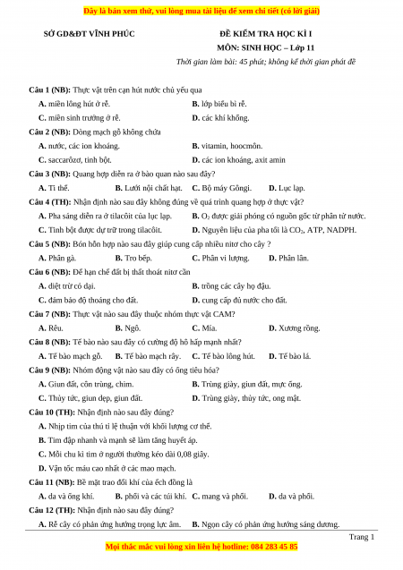 Đề thi học kì 1 Sinh học 11 Sở GD_ĐT Vĩnh Phúc